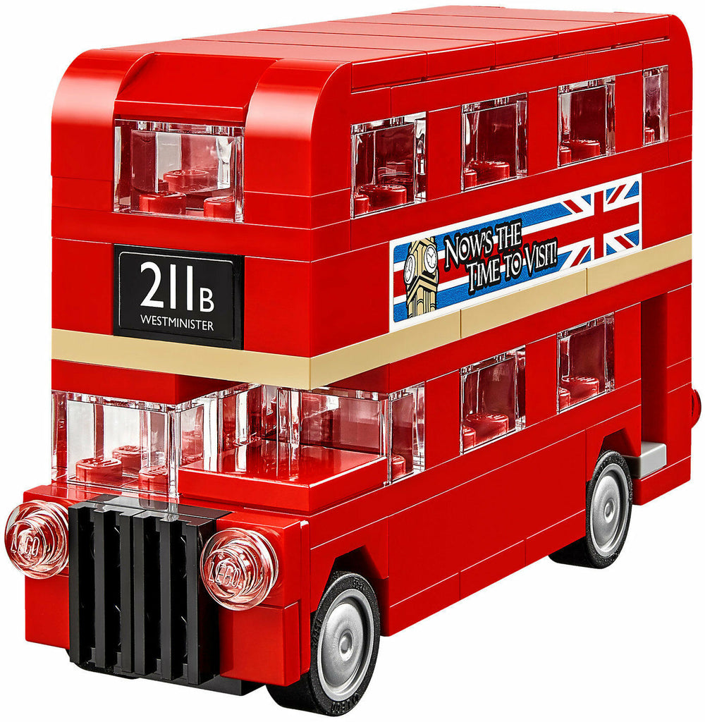 - This buildable LEGO® brick London Bus features authentic details, turning wheels, transparent window and light elements and stickers for the number plate, route number, destination name and advertising banners inspired by LEGO Creator models 21013 Big Ben and 10232 Palace Cinema (not included).